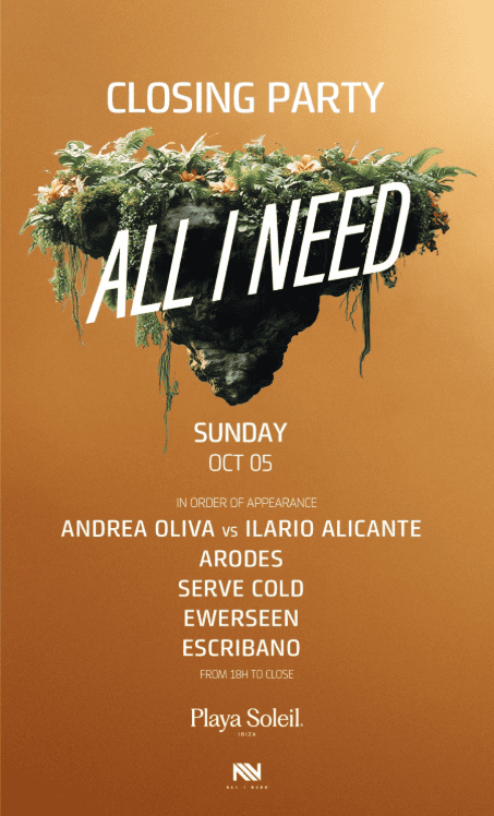In een ruimte als Playa Soleil, waar muziek, gastronomie en kunst samensmelten voor de Middellandse Zee, zal de afsluiting van All I Need veel meer zijn dan een feest: een collectief eerbetoon aan de clubcultuur van Ibiza, met die unieke sfeer die alleen kan ontstaan als de gemeenschap samen danst onder dezelfde hemel.